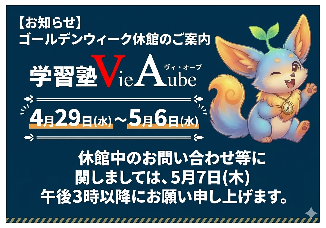 この期間は、すべての授業、自習室の利用、およびお問い合わせへの対応(LINE等含む)を完全にお休みとさせていただきます。 (※休館期間中にいただいたご連絡につきましては、5月7日(木)より順次お返事させていただきます)