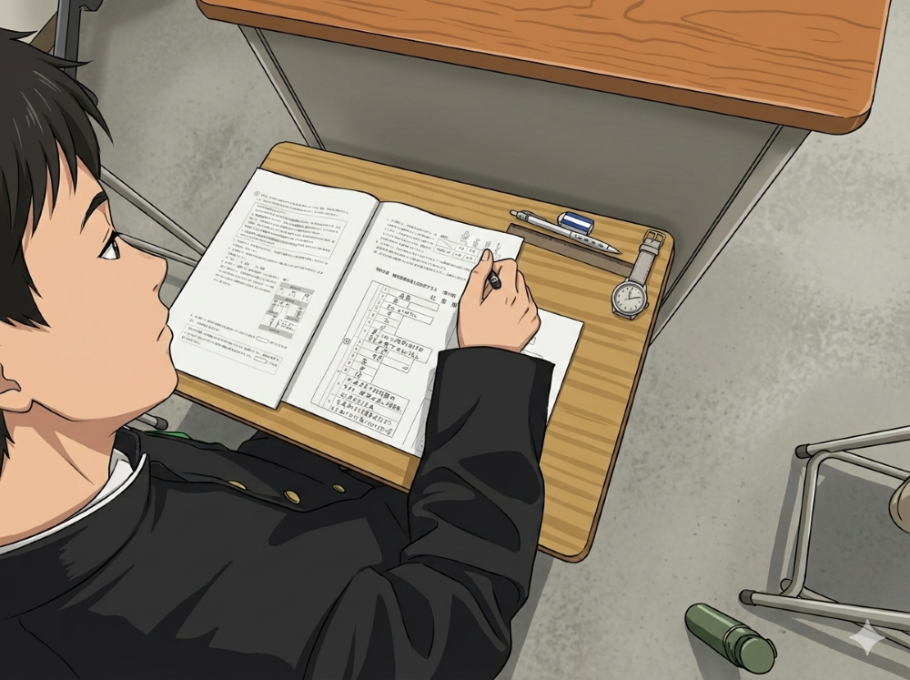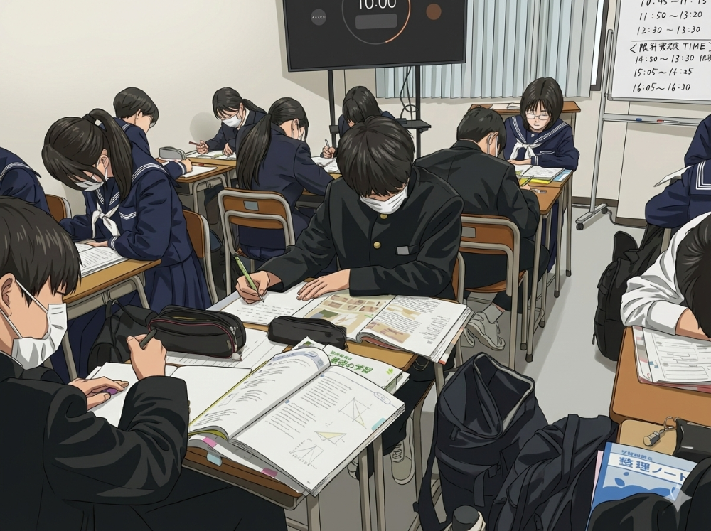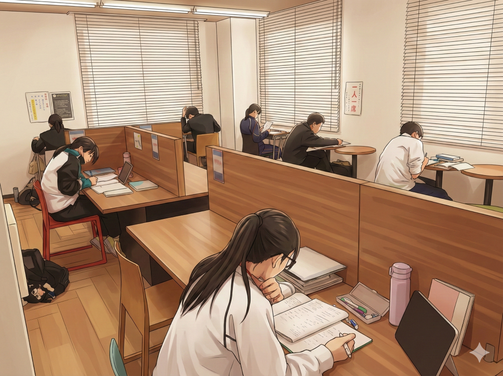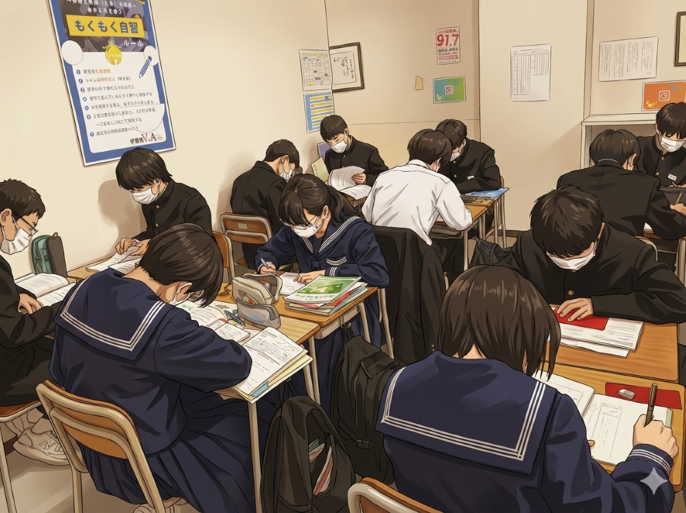 大学入試や学年末考査を控えた高校生たちも、静寂の中でペンを走らせています。彼らの背中が、中学生たちへの無言のエールになっています。