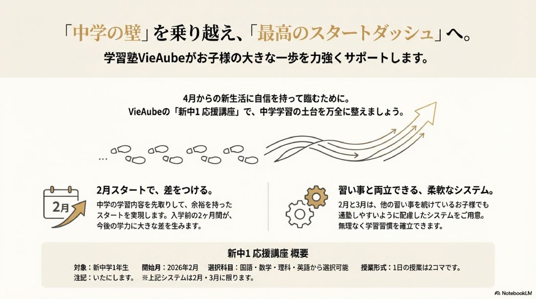 そんな不安を抱える時期だからこそ、VieAube(ヴィ・オーブ)では、4月の入学時に圧倒的な余裕を持ってスタートを切るための「新中1 応援講座」を開講いたします。